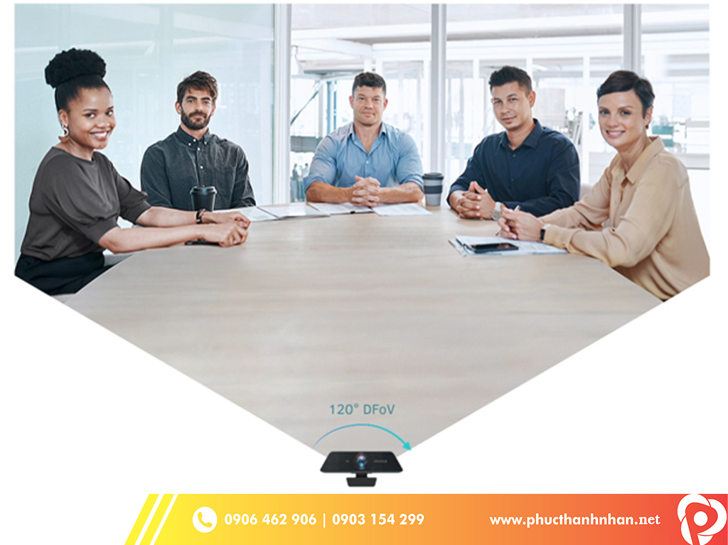 Góc hình siêu rộng 120° FoV kết hợp khả năng xoay ngang 360° cho phép Camera Maxhub UC W21 thoải mái tình chỉnh góc quay , kiểm soát toàn bộ không gian hội nghị .