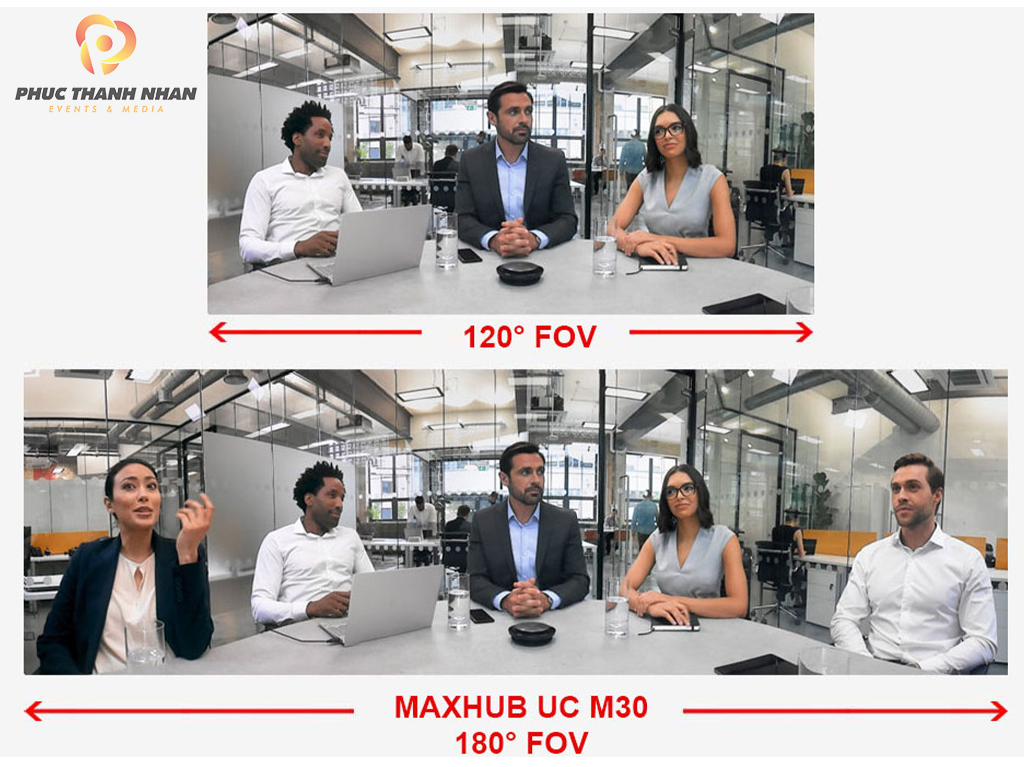 - Camera Hội Nghị Maxhub UC M30 đột phá với 3 camera 12 megapixel, mang đến góc quay 180 độ. 3 camera sẽ cùng kết hợp hài hòa ghi lại toàn bộ phạm vi bao quát của mọi người tham dự cuộc họp và ghép lại với nhau một cách linh hoạt và mượt mà nhất, không để lại vết cắt hay vết chia màn hình bất hợp lý nào.