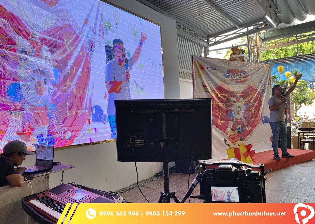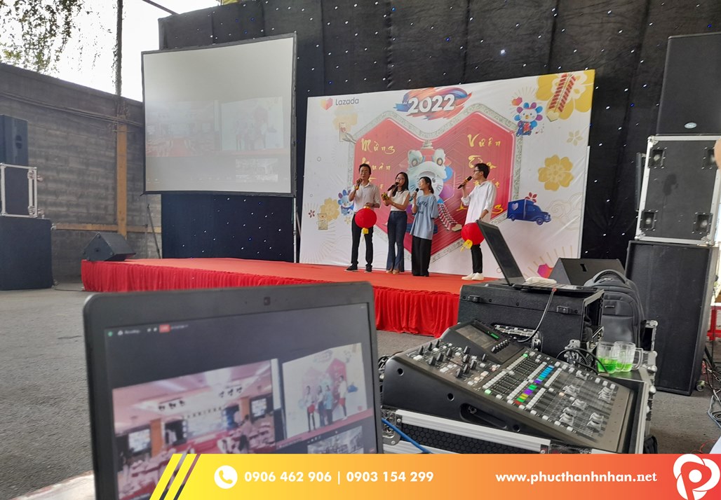 Hình ảnh Kỹ Thuật Viên Phúc Thành Nhân và các thiết bị trực tuyến chuyên nghiệp tổ chức chương trình tất niên trực tuyến tại các điểm khu vực TPHCM